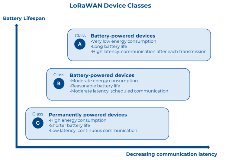 LoRaWAN defines three classes of IoT devices, each tailored to specific use cases — balancing energy consumption against communication responsiveness.